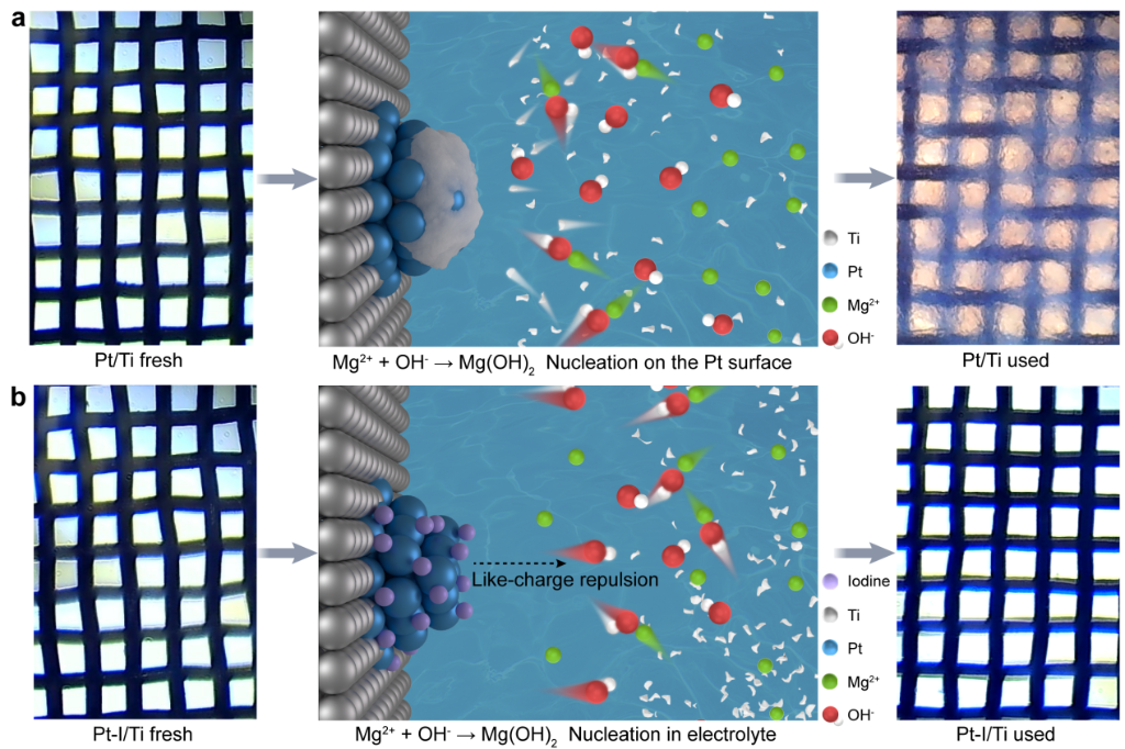针对水电解制氢成本较高的问题,海南大学与中科院宁波材料技术与工程研究所先进了直接电解天然海水制氢提取镁的技术,实现了氢气和氢氧化镁的同时生产,显着降低了制氢成本。相关研究成果于北京时间12月12日发表在国际学术期刊《自然通讯》上。目前,通过电解淡水生产氢气成本昂贵且资源密集。海水是制氢的理想原料,但海水中富含的镁离子容易沉积在电极上电解过程中表面的腐蚀,导致电极过早失效。研究人员开发了一种类似于“不粘煎锅”的新型电极。通过在铂电极表面添加碘离子,利用静电斥力将电解海水制氢反应产生的氢氧化镁移离电极表面并沉积到溶液中,有效防止电极表面结垢。目前,科研团队研发的海水制氢提镁项目样机已能在天然海水中稳定运行5000小时以上。新型电极有效防止海水制氢反应中镁的氢氧化物沉淀,保证稳定运行。新华社(海南大学海洋清洁能源创新团队供图)据天测数据显示,生产1公斤氢气可提取15公斤高纯度氢氧化镁,氢氧化镁的价值基本可以抵消制氢成本。科学家表示,这项创新技术有望帮助实现“绿色氢”的低成本大规模生产。 (记者陈开子)