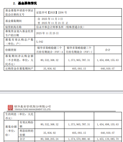 中国经济网北京11月26日电今日,银华基金管理有限公司发布公告,银华多策略三个月稳定持有期混合基金(FOF)合约生效。募集期间净认购金额为1,454,498,155.63元,募集期间认购资金应计利息为640,930.07元,募集股份总数为1,455,139,085.70股。基金经理宋祖强曾任恒盛聚源金融工程研究员、华宝证券研究创新部基金组组长、民生证券资产管理部管理投资经理。他专注于量化分析和投资、衍生品和基金。下班后万联证券g,2024年5月加入银华基金管理有限公司,现任母基金投资管理部投资经理(基金投资咨询业务)。